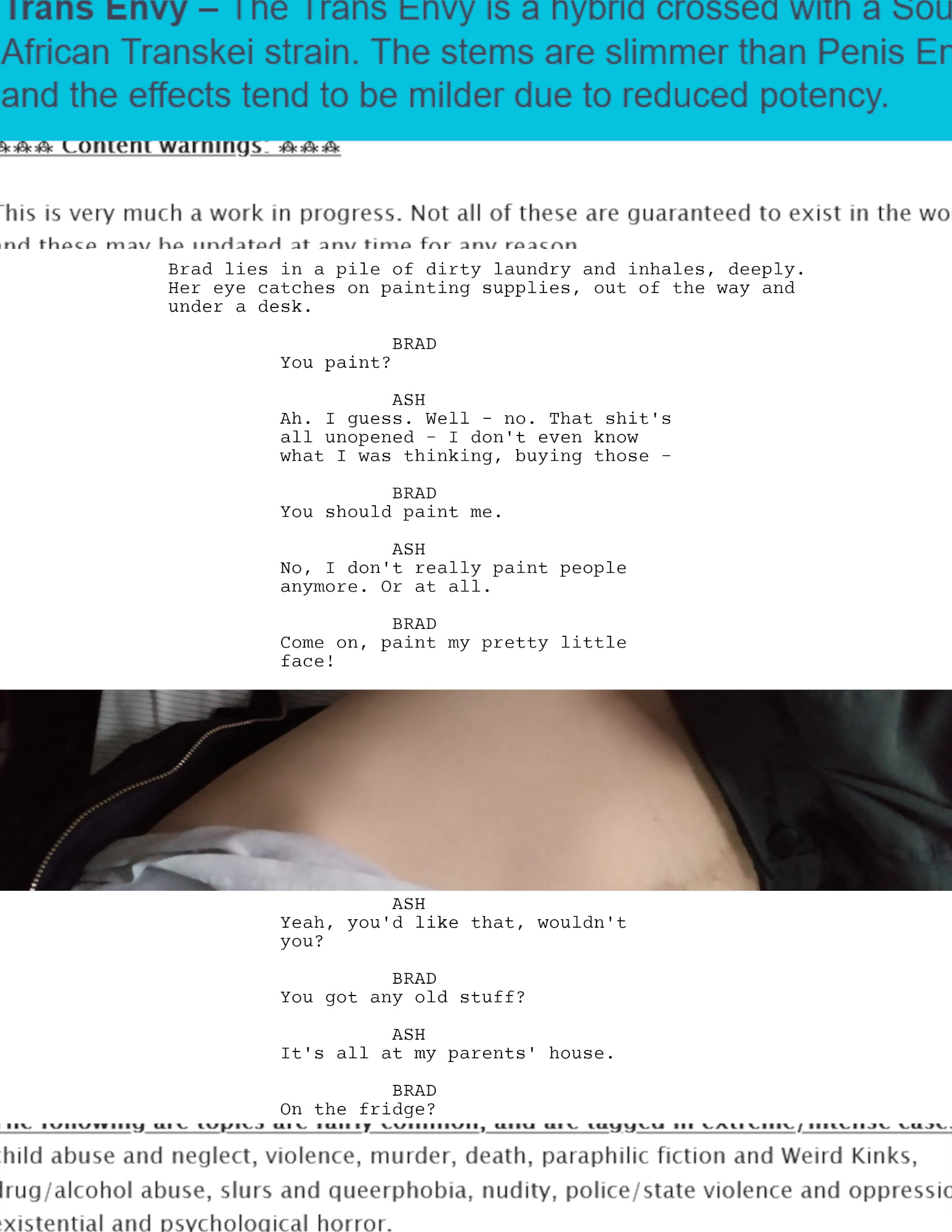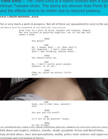 Tagged: #cw toxic relationships #cw violence #cw nudity #cw suggestive imagery #cw violent sex #cw snuff #cw knifeplay #cw incest (kayfabe) #(?) #cw emetophilia #cw hypnosis #cw other implied sexual transgressions #cw transphobia #cw gaslighting #cw slurs #cw suicide #cw unpersoning #&c.